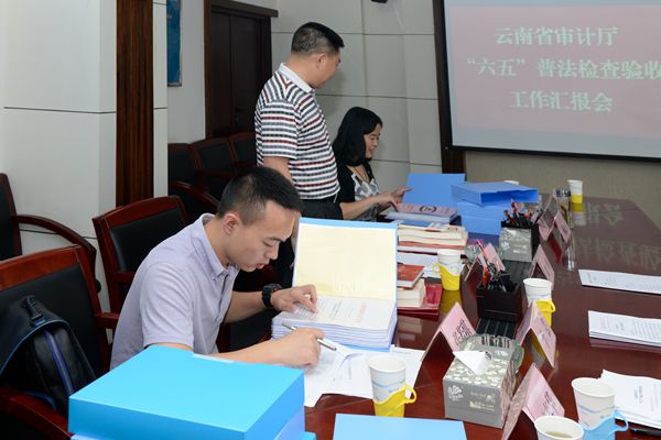 审计厅党组书记、厅长代表厅党组对检查组的到来表示欢迎,并就审计厅“六五”普法工作情况作了简要介绍。随后,审计厅相关部门向检查组全面汇报了“六五”普法工作情况,包括贯彻党的十八届四中全会、省委九届九次全会精神情况,贯彻落实“六五”普法规划、人大《决议》情况,创新法制宣传教育工作情况,组织领导和保障措施情况等四个方面,检查组认真查看了台账,并对照评分标准进行了现场评分。