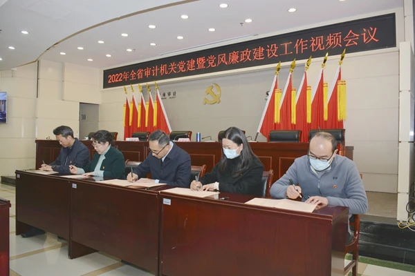 会议传达学习了十九届中纪委六次全会、省纪委十一届二次全会和2022年全国审计机关党风廉政建设视频会议精神;驻省审计厅纪检监察组组长龚学艺同志总结2021年度履行党风廉政建设监督责任情况,部署2022年党风廉政建设监督责任工作任务;厅党组书记、厅长谢健同志总结全省审计机关2021年度全面从严治党工作情况,部署2022年全面从严治党工作任务;组织厅机关各处室签订了2022年度《党建工作目标管理责任书》和《党风廉政建设责任书》。