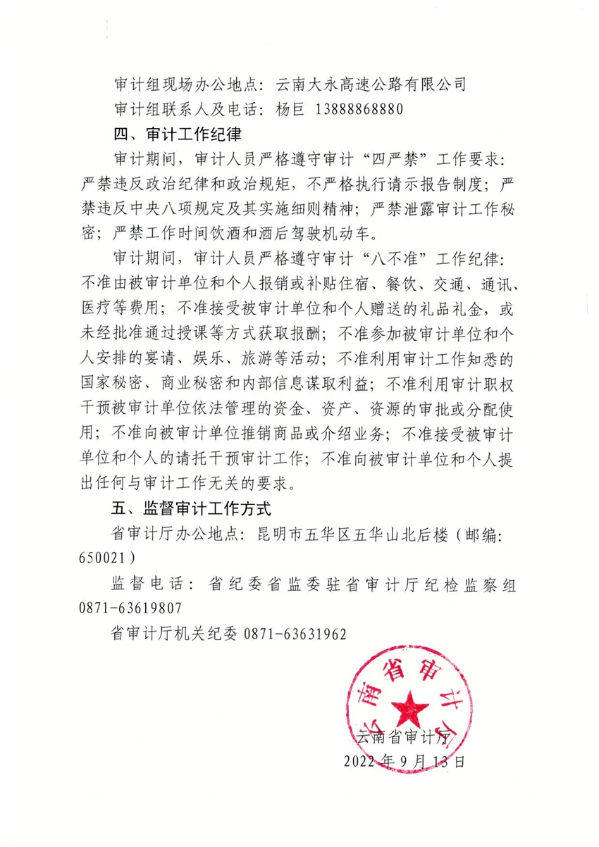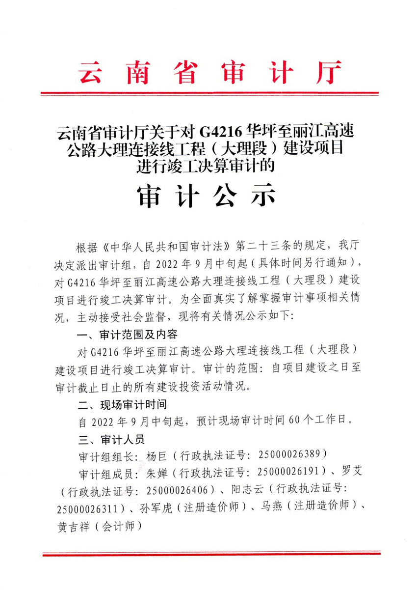 云南省审计厅关于对G4216华坪至丽江高速公路大理连接线工程(大理段)建设项目进行竣工决算审计的审计公示