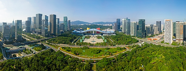 这是在广东省深圳市拍摄的深圳市民中心和莲花山公园一线(2020年10月2日摄,无人机照片)。新华社记者 梁旭 摄