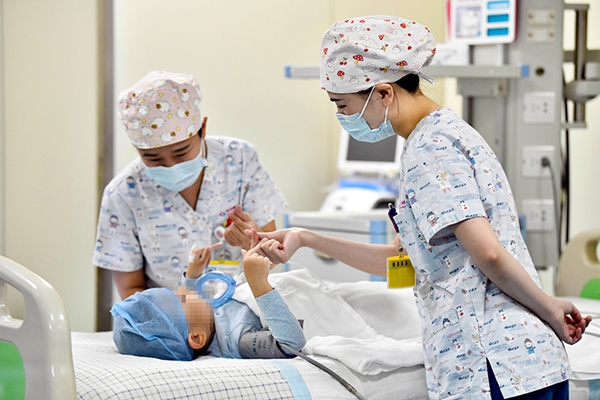 在山东省枣庄市妇幼保健院儿童ICU病房,医护人员为完成靶向治疗药物诺西那生钠的4岁脊髓性肌萎缩症患儿加油鼓劲(2022年1月1日摄)。诺西那生钠注射液是我国首个获批治疗脊髓性肌萎缩症的进口药物,2019年进入中国市场时,每针价格近70万元。在2021年国家医保目录药品谈判中,以3.3万元每针的价格进入新版医保药品目录。新华社记者 郭绪雷 摄