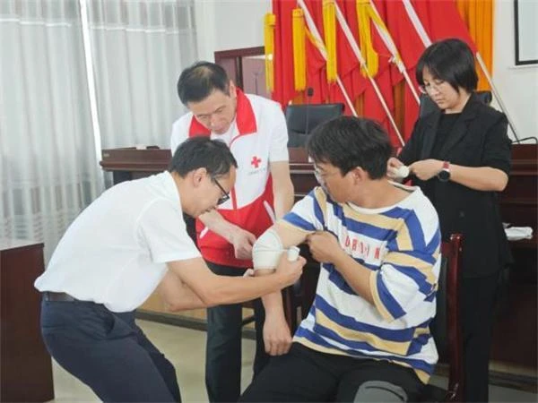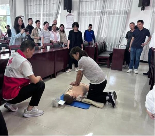 培训由省红十字会救护培训师资、龙头山镇驻村工作队队员沈成法担任主讲,采用“理论讲解+实操演练”相结合的模式,重点围绕心肺复苏、气道异物梗阻急救(海姆立克法)、创伤包扎等实用技能操作开展培训。通过培训,参训人员了解了应急救护的重要性和具体操作方法步骤,有效提升了应急救护意识,掌握了自救和互救技能,提升了“黄金四分钟”急救能力。培训现场气氛热烈,小寨镇近百名干部和群众认真聆听讲解并积极参与互动。鲁甸县红十字会派员到现场进行专业指导。