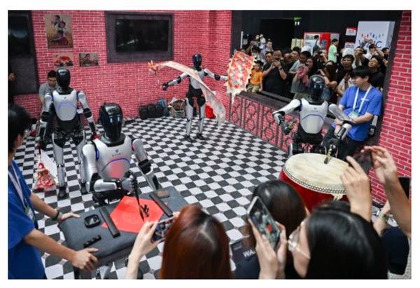 图为2025世界人工智能大会上,机器人进行“才艺”展示(7月29日,新华社记者陈浩明 摄)