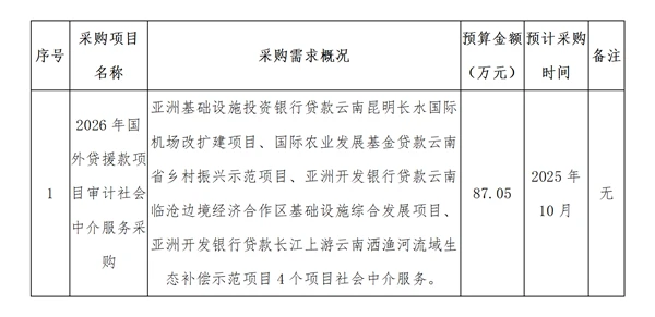 为便于供应商及时了解政府采购信息,根据《财政部关于开展政府采购意向公开工作的通知》(财库〔2020〕10号)等有关规定,现将云南省审计厅2025年9月至2025年10月政府采购意向公开如下: