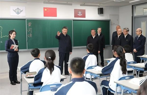 北京市援建的北京四中雄安校区2023年8月投入使用,现有学生380多人。教学楼里,学生们正在上课。习近平走进初一(2)班教室,同师生交谈,了解教学情况。他希望把北京四中办学的好经验好做法带过来,用心用情呵护孩子们身心健康,促进孩子们全面发展。