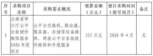 为便于供应商及时了解政府采购信息,根据《财政部关于开展政府采购意向公开工作的通知》(财库〔2020〕10号)等有关规定,现将云南省审计厅2026年4月采购意向公开如下: