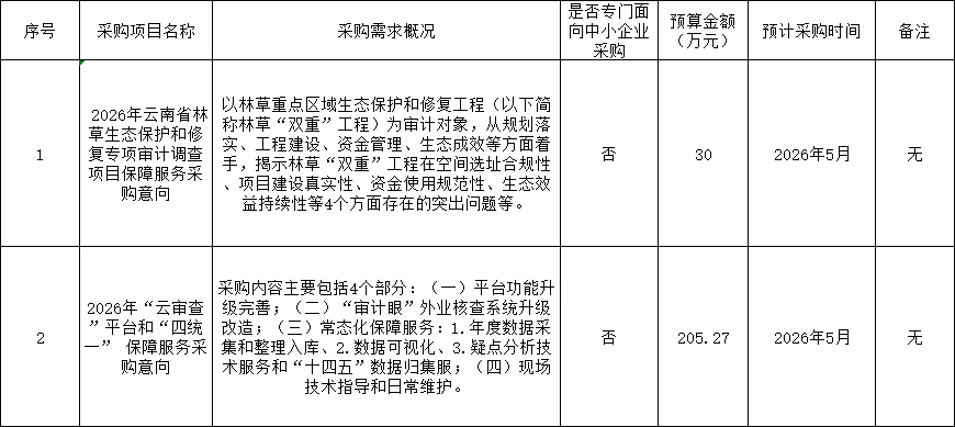 为便于供应商及时了解政府采购信息,根据《财政部关于开展政府采购意向公开工作的通知》(财库〔2020〕10号)等有关规定,现将云南省审计厅2026年5月(至)2026年6月政府采购意向公开如下: